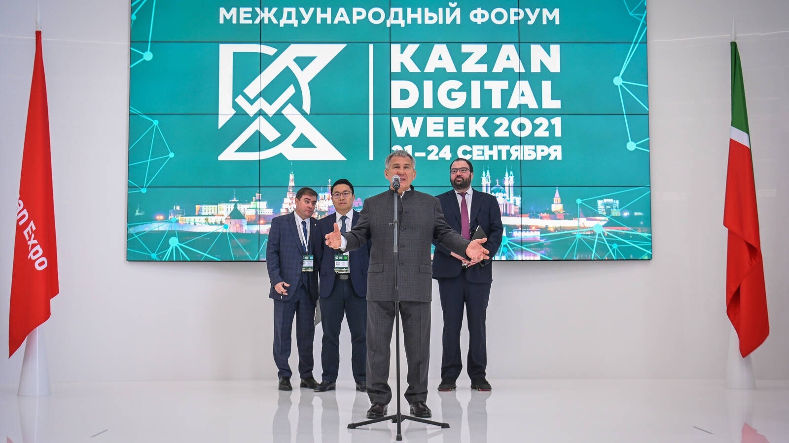 Президент Татарстана Рустам Минниханов и министр цифрового развития, связи и массовых коммуникаций РФ Максут Шадаев приняли участие в открытии международного форума Kazan Digital Week 2021. Мероприятие пройдёт с 21 по 24 сентября на площадке «Казань Экспо».